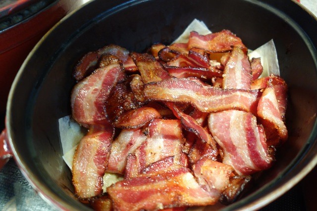 アメリカ特有のたっぷりの脂を湛えたベーコン。こいつをガリっと焼き上げて、美味しいですよね。