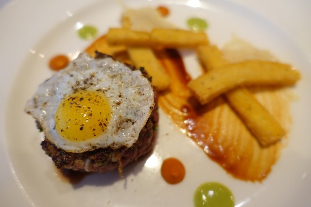 前菜に牛肉のタルタルを注文。結構火が入っており、我がこころのベストハンバーガーである芝公園のマンチズ・バーガー・シャックのパティに近しい。うずらの卵やポレンタ(トウモロコシを潰したもの)のスティックの意図は不明ですが、見た目の通りの味わいに大満足。