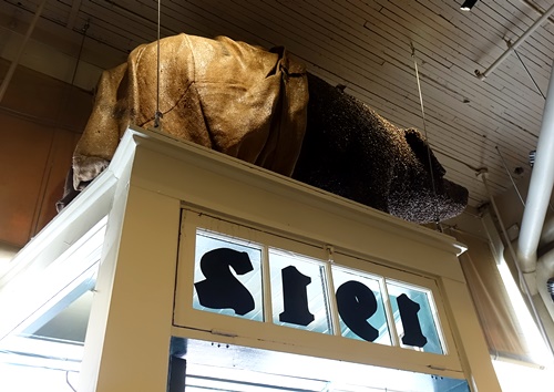 中に入ってドアの上を見上げると~パイクプレイスマーケットの名物「豚のレイチェル」!
