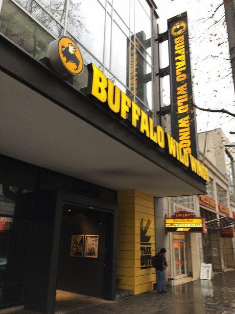 当地では何故か新年にBeethoven第9となっておりBenaroyaホールでのSeattle Symphonyの2PM開演の前にランチをということで、前から気になっていたBuffalo Wild Wingsさんに行きました。本来はSpicy/Hotな鶏の手羽先料理の店で、ビールを傾けながら、ということなのですが、店員さんは皆Seahawkesの恰好しているし、店内至る所に大型スクリーンがあってスポーツ番組を生中継で垂れ流しており、完全にSports Barと化しています。Wings(Snackサイズ)、Buffalo Poteto、Garden Salad、Beer(Samuel Adams IPA)で税チップ込みで$30、Downtown一等地の場所柄からすると妥当なお値段です。