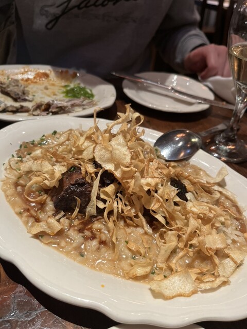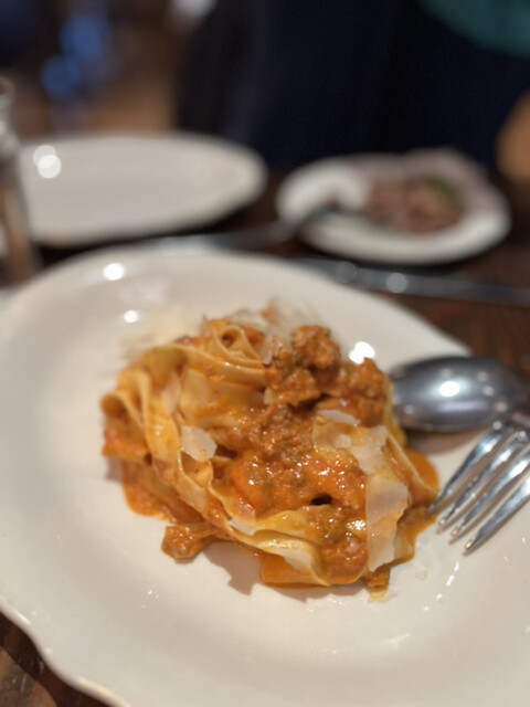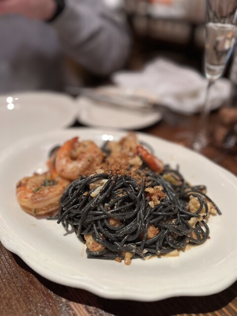 生牡蠣やクロスティーニからスタート。白身魚、中毒性のあるイカ墨のパスタ、ポロネーゼも美味い。