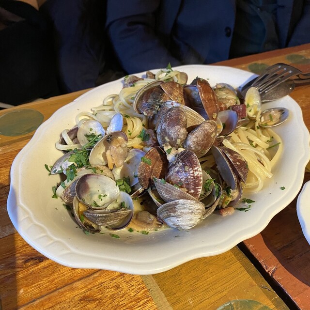 ホンノビス貝(たぶん)のボンゴレ・リングイネ。3%以上と思われる湯で容赦なく茹でた麺に貝の旨みが絡む絡む。