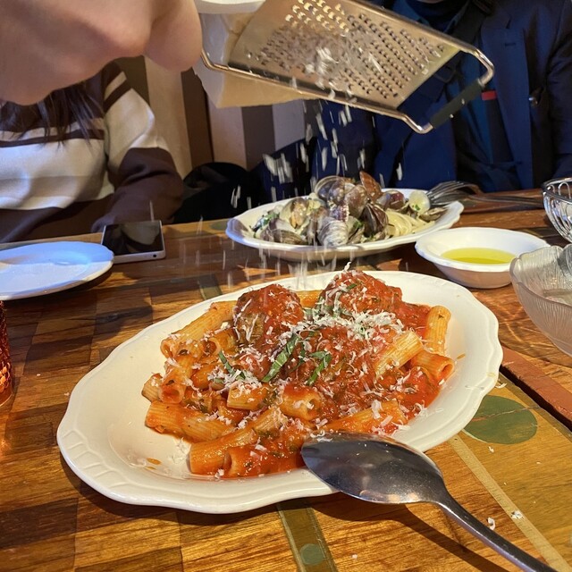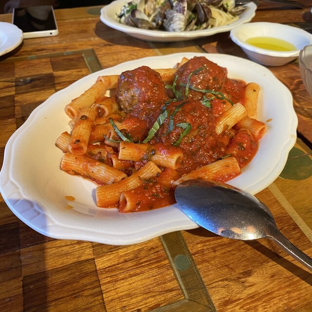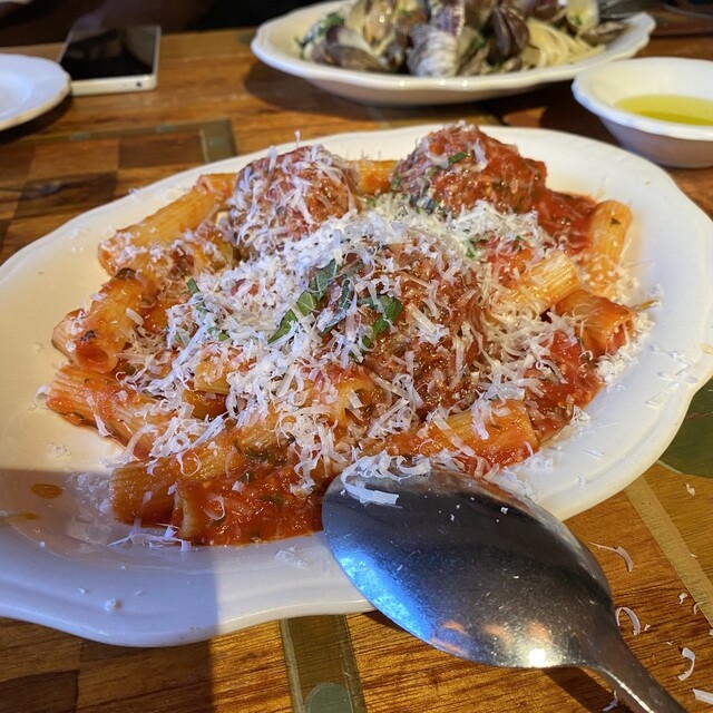 プッタネスカ・アンド・マンマズ・ミートボール。つまりおっかさんのミートボールマカロニ。意外や麺の茹で具合は今日的である一方、ミートボールは実質的かつクラシックで佳良なりはべり、ありおりはべりいまそがり
