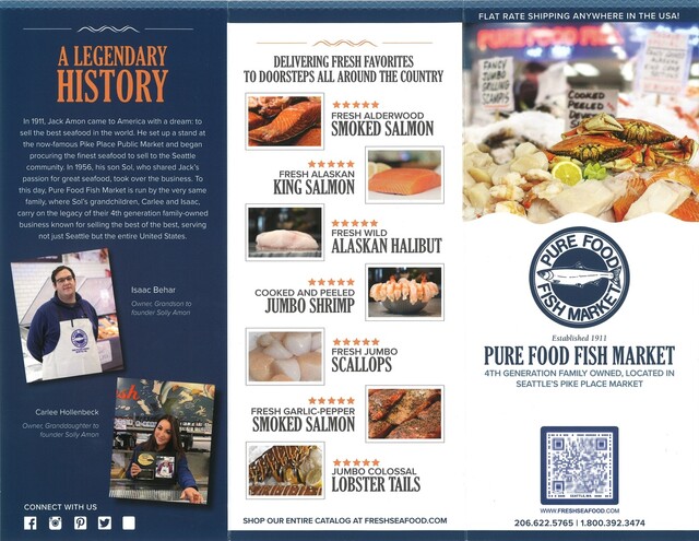 Located within Pike Place Market, Pure Food Fish Market was established in 1911 and offers fresh, locally caught seafood, as well as smoked and other processed products.
