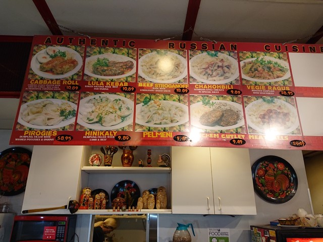ただ、朝サモサを食べたのでどうしようかなと思っていると、ピロシキ以外にロールキャベツなどなどのロシア料理のメニューも掲示されている。そこで、BEEF STROGANOFFを注文。表示は10.89ドル。会計は税が足されて11.98だった。