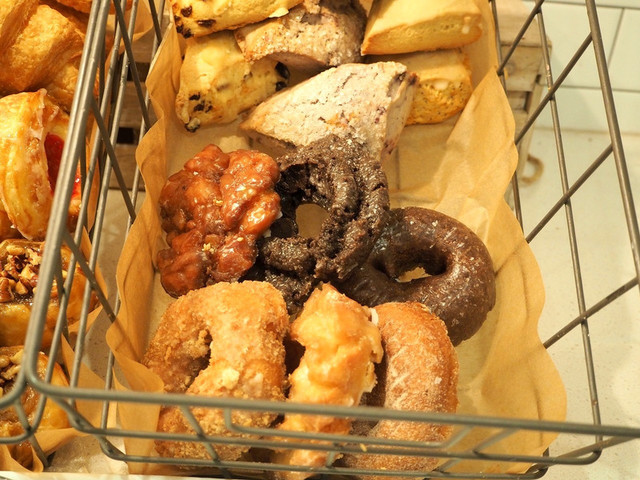 旦那は、肉好きらしく、ベーコン・ソーセージを中心の内容に。パンは、ドーナツとピーカンナッツのシナモンロール。妻には耐えられない組み合わせですが、旦那は好物に囲まれてにんまり。(こういうものを食べても太らない旦那の体が羨ましい・・・)味見させてもらいましたが、見た通りの甘々でした。