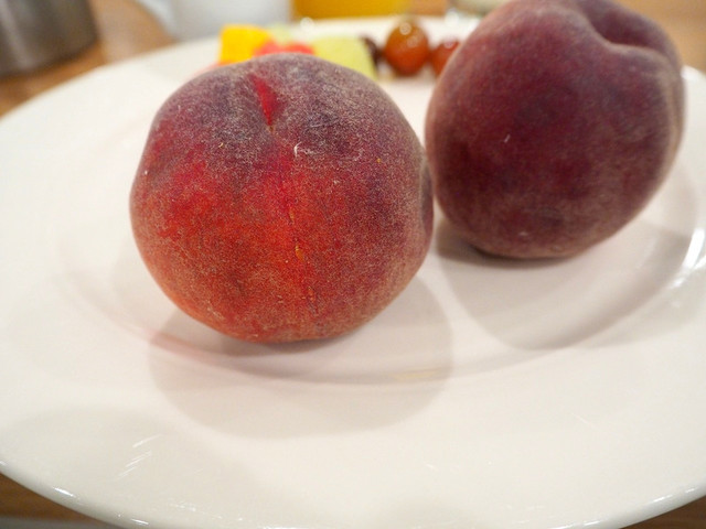 妻も好みの物を少しだけ。種類豊富なパンの中からは、スコーンを選んできました。スコーンはスタバ系のお味でした。ヨーグルトにフルーツをトッピングしてきました。旬だったのか、美味しいフルーツが多くてうれしい朝ごはんです。美味しそうな桃を見て、思わず2ついただいてきました。果汁たっぷりの完熟白桃。お行儀が悪いのですが、最後はかぶりついてしまいました(^^ゞ