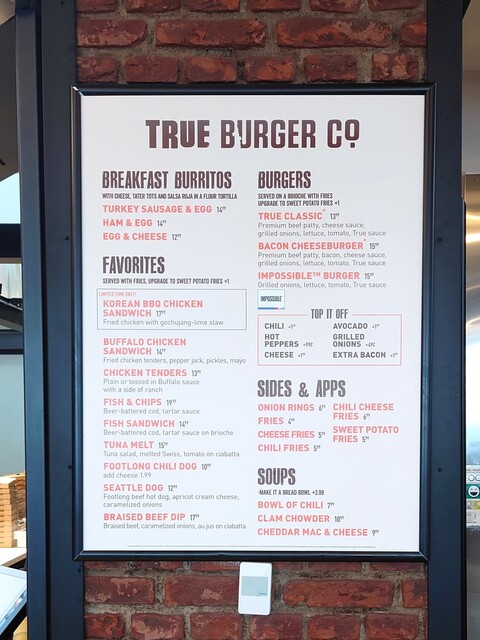 True Burger Co.のメニューは、トゥルークラシック、ベーコンチーズバーガー、インポッシブルバーガーの3種類のバーガー。