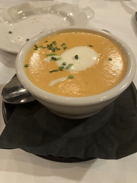 わちゃわちゃ会話してるうちに前菜が届く。自分はロブスターのビスク。こってり濃厚で、ロブスターの身もたっぷりだが、ちょっと生クリーム多めでクドイかも。
