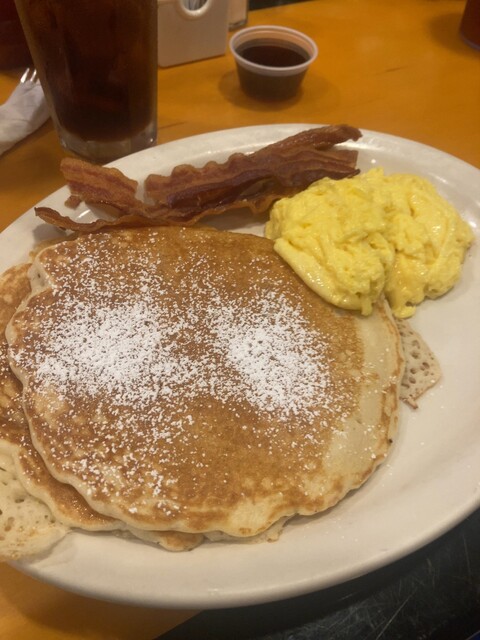 【パンケーキ、スクランブルエッグ、ベーコンのせ】