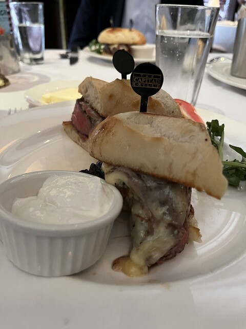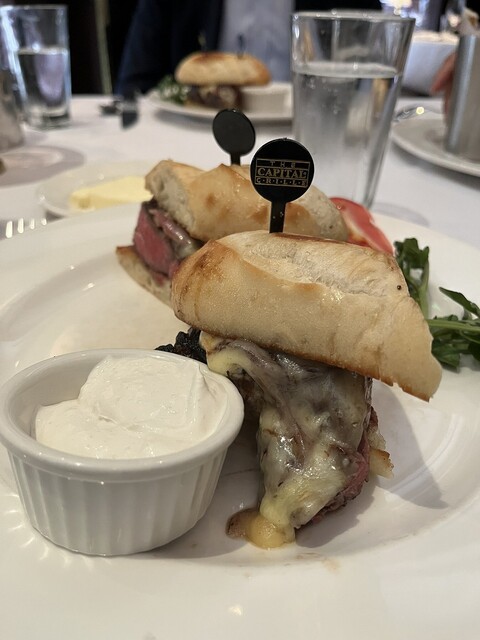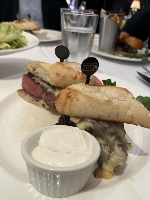 とってもおいしいリブアイのステーキのお店です。今日はまず、オニオンスープをたのみます。チーズがたっぷりで最高。しして、リブアイのサンドイッチでした。サンドイッチのなかに非常に分厚いステーキです。ジューシーで最高でした。ワインものみたかった。でも昼間だからこらえて、アイスティー、とガス入りのお水。最高でした。そしてシーザーサラダもとてもおいしかったです。ポテトも最高でした。ステーキは本当においしい。やっぱりお肉の基本は赤身だと思います。赤身がおいしい、これが本当のお肉のだいご味ではないでしょうか