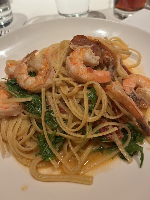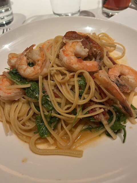 ゆでスギのパスタ、海老がたくさんはいっていて、具はおいしいのですがパスタは残念。ボストンクラムチャウダーはおいしいです。また、サラダ、シーザーサラダもとても美味しいです。アメリカではパスタはほとんどオーバーボイルなのでパスタは食べないほうがいいかもですね。ゆですぎで量だけおおくて、あきてしまいますね