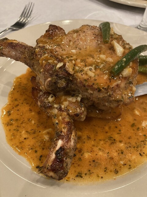昔ながらのイタリア料理のお店って感じですね。前菜のカラマリがとにかく美味しかったです。新鮮なカラマリ、に海老がはいっていて、とっても美味しい。ソースが最高であります。そしてメインは私は豚肉、ポークのチョップ、PORK CHOPSです。とてもジューシーな豚肉、が肉汁たっぷりの状態で、いい感じでやきあげっられています。とっても美味しかったですね。最高でしたワインはとても美味しいピノノワールをいただきました。最高でございました。
