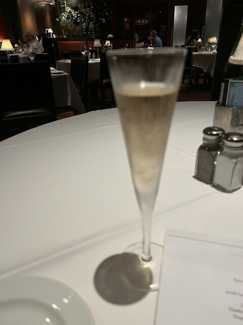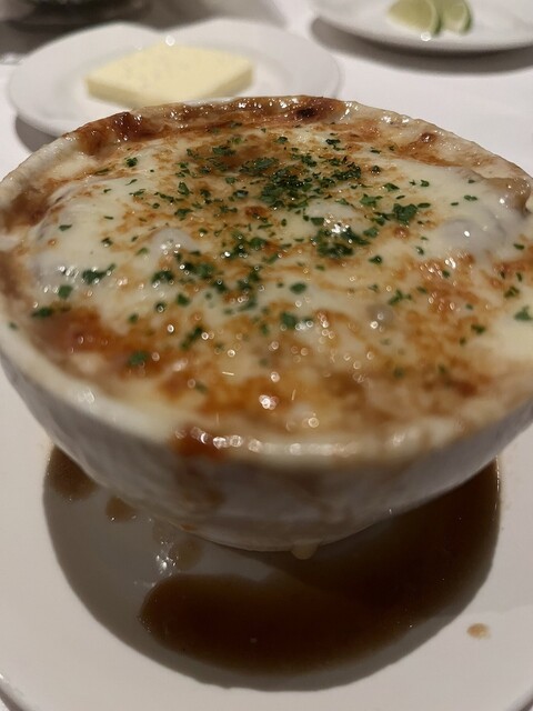 フィレミニョンをいただきました。そしてサイドにはアスパラガス、さらにスピナッチ、そして前菜にはオニオンスープをいただいております。これが最高でございまし...