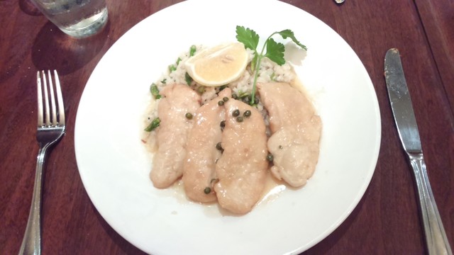 Pollo Piccataは、チキンピカタですが、チキンの胸肉を使っているためか、あっさり。ソースもバターをベースにレモンとケッパーであっさり。まあまあでした。