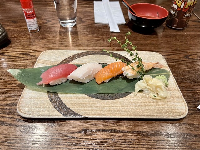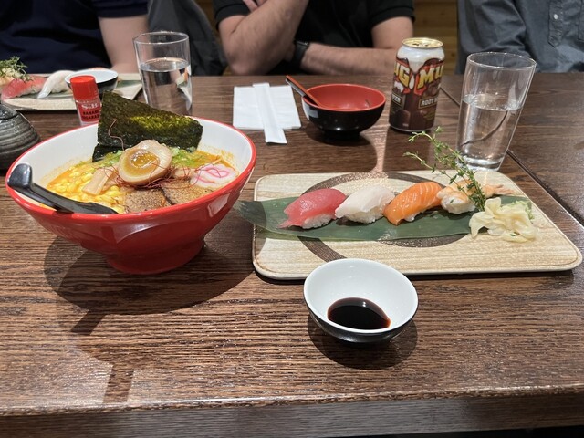 私は、寿司アペタイザー (11.00ドル) とスパイシー豚骨ラーメン (15.00ドル) を注文。