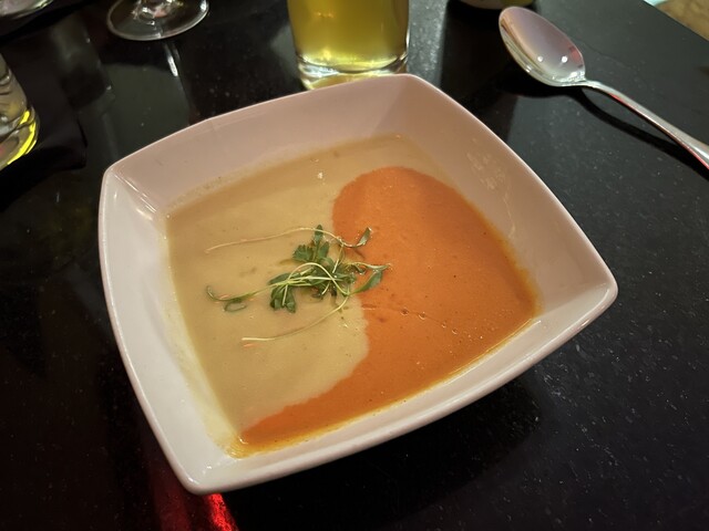 一品目はコーンとトマトのガスパチョ。甘いコーンとピリ辛トマトで美味しい。