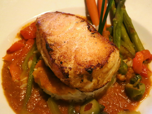 グリルしたスズキがアガベ・ライスの上にのっています。