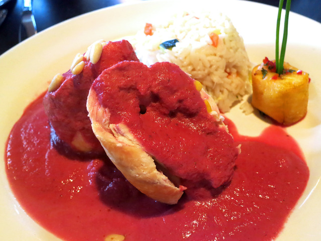 鶏ムネ肉をピンク色のソースでいただきます。この色鮮やかなソースは,クルミとチポトレ(乾燥した唐辛子)から作られています。