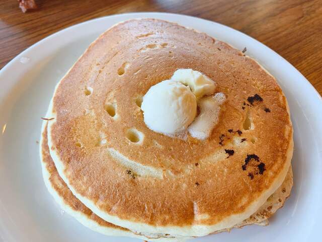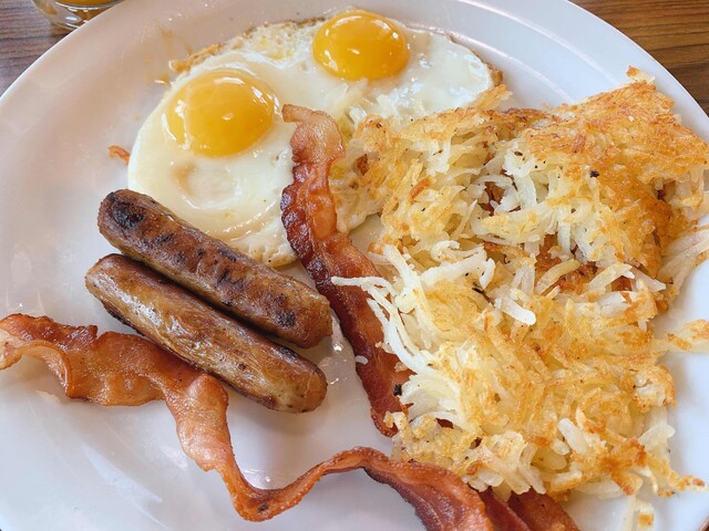 定番のパンケーキに目玉焼きが2個とハッシュドポテト