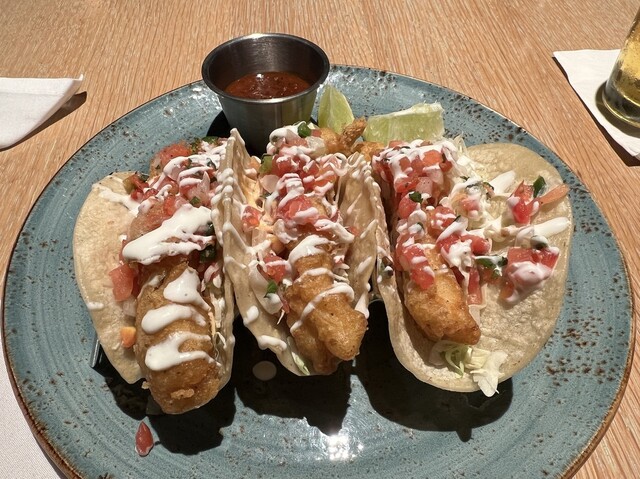 外出するのが面倒になったので宿泊先のMarriott Coronado内にあるAlbacaというレストランで夕食となりました。クラムチャウダーとシーフードタコスを注文。