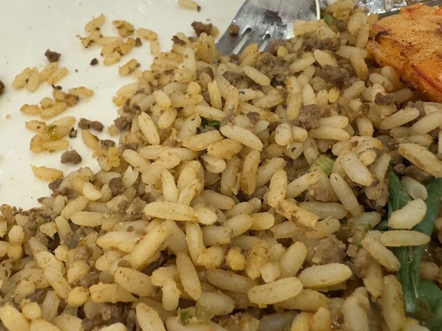 「ダーティーライス」は、パラパラしてます。カレーっぽい風味も感じます。米は、日本の米とは異なる、大粒で、少し硬いやつ。ひき肉が混じっています。