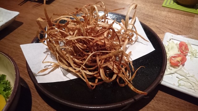 5人で伺って注文したのは、枝豆、イカのわた焼き、ポテトサラダ、鶏唐揚げ、牛串焼き、ゴボウチップ、焼き鯖、台湾ラーメンなど。焼鳥がないのが不思議ですが、ポテサラを押さえているところはさすがです。