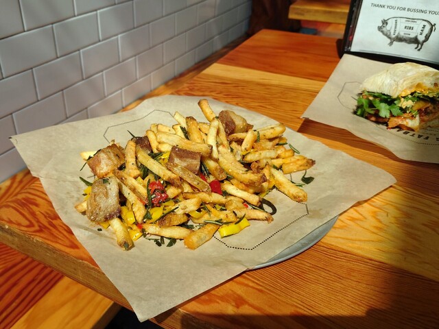 The menu at Lardo features a variety of unique items, including pork-filled sandwiches, large meatball banh mi, and hand-cut fries generously topped with pork. As part of their commitment to quality, they use bread from the local Dos Hermanos Bakery.