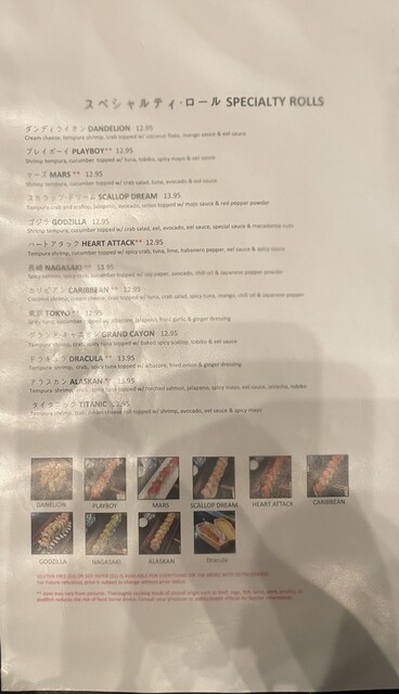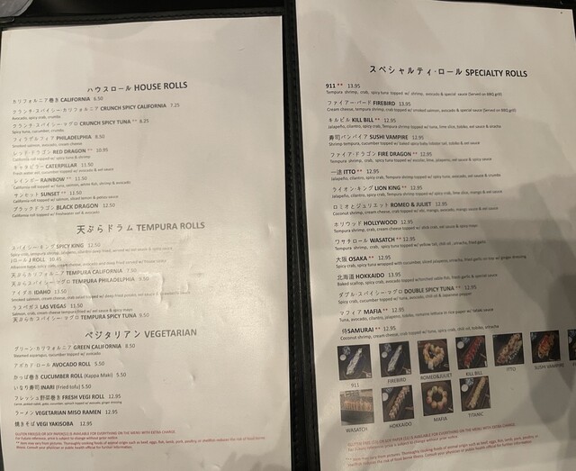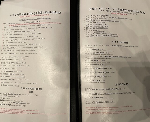 店内は天井がやたらと高い、カフェ風な作り。ちょっと奇抜で、今まで見たことのない感じです。若い客が多く、ゆっくりと日本の食べ物を楽しむかんじではありません。メニューを見ると、スシ以外にもうどん、ラーメンもあります。価格はかなり低めに設定されており、ちょっとびっくり。照り焼きビーフが$14.95など、ほぼ20年前の価格です。