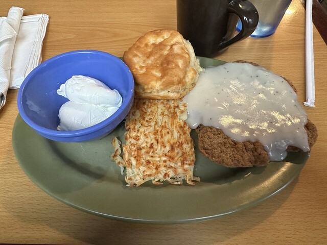 典型的な南部スタイルの朝食。カツレツにグレービーソース、ぽードエッグ、ハッシュブラウンというボ...