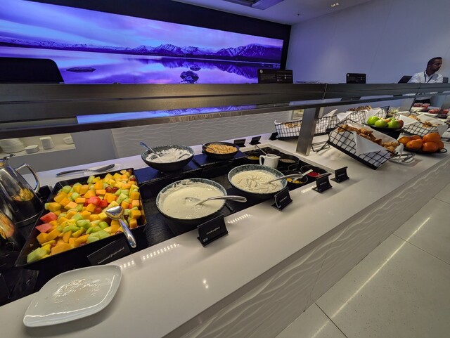 食事のラインナップは中々のもので、サラダだけで4種類に野菜スティックも3フレーバーと、野菜にかける情熱が感じられます。チーズも豊富でラム肉の煮込みなども置かれており、日系のビジネスクラスラウンジとは一線を画すレベルの高さです。