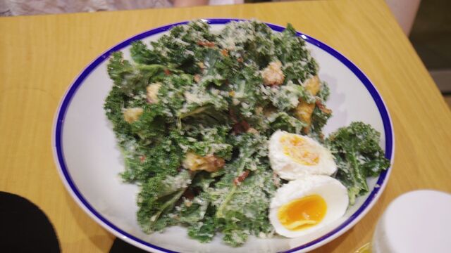 塩漬けケール、カリカリベーコン、パルメザンチーズ、半熟卵、ローストした松の実です。
