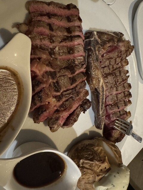 普段、いきなりステーキで300g食べられる方。楽勝です。熟成肉450gと、プライムビーフ350gをオーダーしましたが、レアで。熟成肉鬼うま。こげと肉最高の組み合わせです。ビールはオーストラリアのビール頼んでポテトはフライとベイクドにしました。ベイクドは焼いた芋出てくるかと思いきや、芋全体のお姿で登場。おすすめは赤ワインソースかマッシュルームのソースらしいですが、熟成肉はそのままが1番上手いです。ソースつけたらチープな味になってしまう…涙