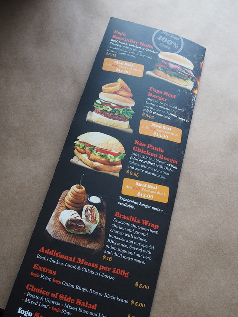 テラス席と店内の席があります。とても気持ちよいお天気の日でしたので、外の席に座ることにしました。シュラスコグリルの「fogo」というチェーンレストラン、メニューの表紙は「炎のレストラン」ですね(笑)シュラスコの肉料理が乗ったプレートの他、サラダ、バーガーなどがあります。バーガー類もボリューム満点、パテ2倍も楽しめます。メニューの中から、夫婦ともに、肉料理を選びました。