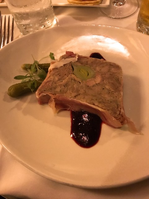 鴨のコンフィをプロシュートで包んだテリーヌを、ベリーのソースとピクルスでいただきます。見た目通りですがこれも悪くないですね。