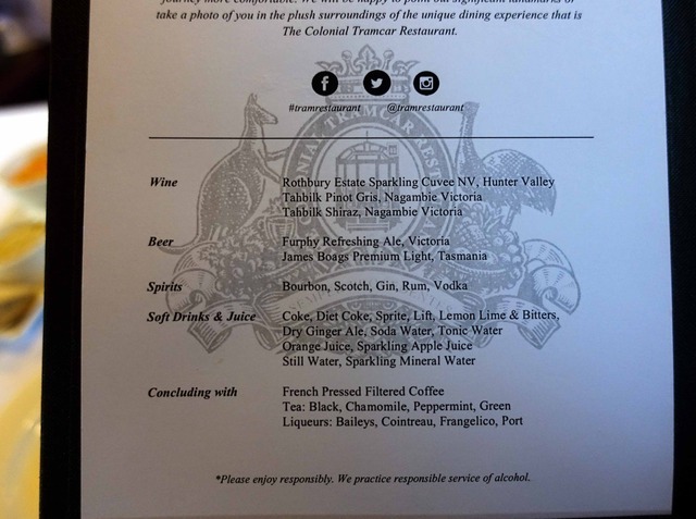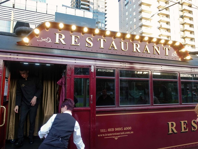 「コロニアル・トラムカー・レストラン The Colonial Tramcar Restaurant」は,改造したクラシックなトラムに乗って,街を走りながらオーストラリアの伝統料理を楽しむことができる“走るレストラン”です。料理はすべてコースになっており,ランチ(13時~15時,4品),アーリーディナー(17時45分~19時15分,3品),レイトディナー(20時35分~23時30分,5品)の3つのコースがあります。旅の思い出として利用する観光客や,特別な記念日を祝う地元の人たちでいつもにぎわっています。
