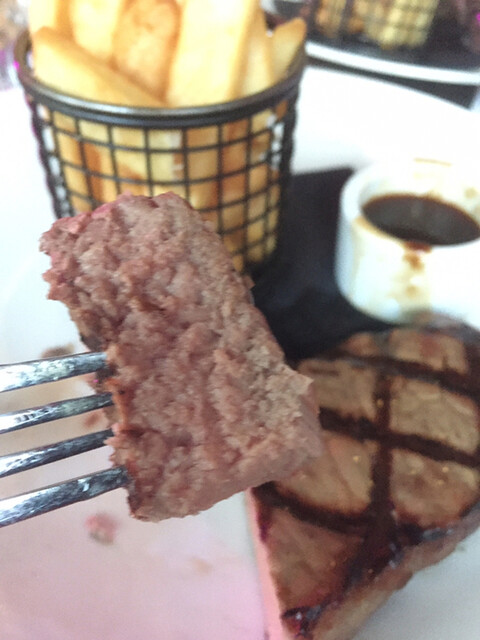 そしてフードはくる。なんやコレ? 既製品ちゃうか?と思うような出来上がり。ミディアムレアのはずやねんけど、かなり中まで火が通っとうやんけ。。。全然違うもんが出て来た感があって、戸惑ったけど、ほぼローストビーフ状態。なので、「コレはローストビーフなんや」と自分に言い聞かせ食べたら美味くなった。けど、味が薄いんでソースにつけなあかんかったな。