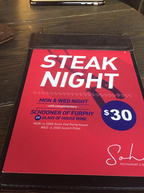Yarra River沿いのSouthbank側にある店。観光地にもあるんやけど、近くのオフィス街からの客が多かったな。川が見え、メルボルン市街も見渡せ、風通もよく非常に清々しくて気持ちがええ場所。この夜は「Steak Night」と言うことやったんで、それも目当てに入店。ま、それがなくてもパティオとインドアの仕切りが取られてて開放感があるのに惹かれて入ったんやけどね。