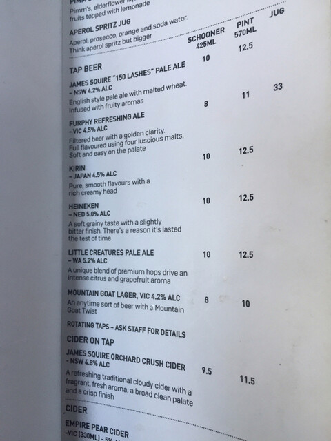 ま、雰囲気ええし、ビール(Furphyと言うブランド。エール)は美味かったし、ドリンクだけ目当てで来るのも十分。フードはあんま期待せんほうがええ。