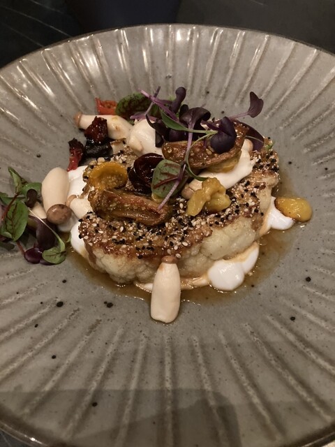 最初のパンに添えられたバターがふんわりとてもおいしかった スターターのオーダーは慎重に私に食べられるものだけでできた餃子状のパスタ中身は細かく切られたマッシュルームにソースはトマト メインはカリフラワーのステーキ ミソとゴマのソースでクリームチーズ系ソースの上に乗っている きのこ添え