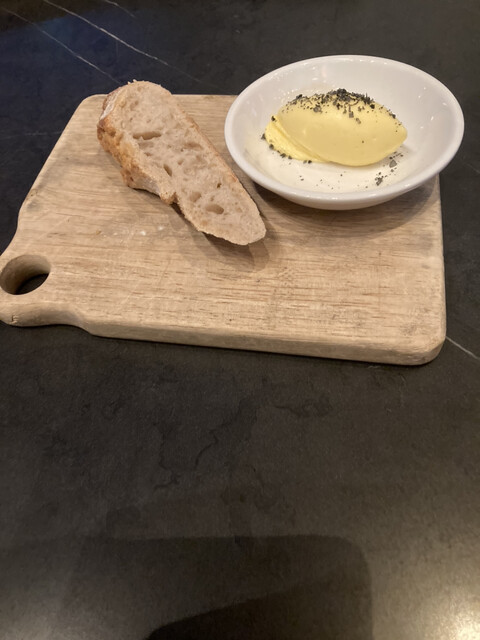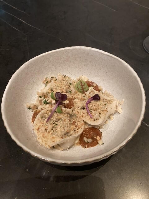 最初のパンに添えられたバターがふんわりとてもおいしかった スターターのオーダーは慎重に私に食べられるものだけでできた餃子状のパスタ中身は細かく切られたマッシュルームにソースはトマト メインはカリフラワ...