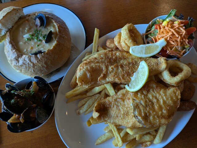 盛り合わせプレート的なもの。定番のフィッシュ&チップスにイカ・エビ・ホタテのフライ、サラダにムール貝の煮込みが付随します。これだけ盛り込んで6千円程度なのは大変お値打ち。ディズニーシーで注文すれば2万円ぐらい請求されそうです。