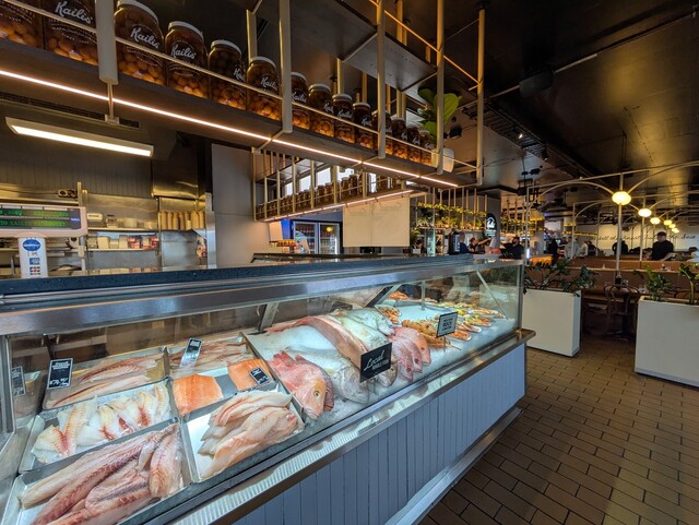 ひとつの店舗ながら海産物に限定した巨大フードコートのような空間。揚げコーナーや焼きコーナー、酒コーナーなどいくつかのエリアに分かれており、好きな料理を注文し、ブルブル震える番号札を渡され、ブルブルしたらセルフで取りに行くという仕組みです。テラス席もありかなりの大箱なのですが、人気の観光スポットでもあるので、念のためネットから予約して訪れると良いでしょう。