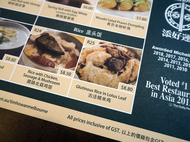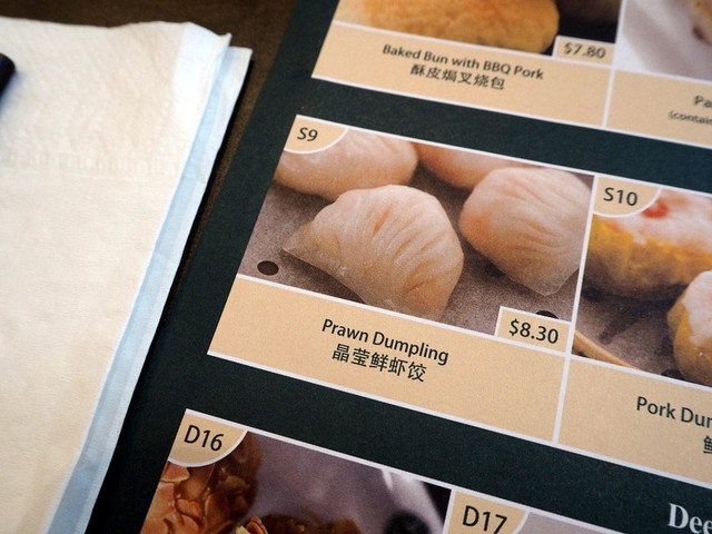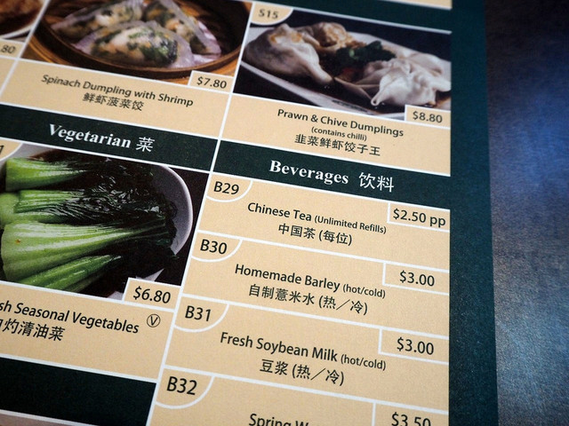 案内された席に着き、メニューとにらめっこ。久しぶりの「添好運」に興奮気味の夫婦、何を食べようか相談しながら盛り上がりました(^^ゞオーストラリアのメニューはお値段入り。写真に加え、お値段まであると、飲茶の注文に不慣れな方でもわかりやすいですね。