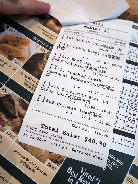 点心3品に野菜、おこわ、お茶を注文して40.90ドル。香港よりはお高めです。