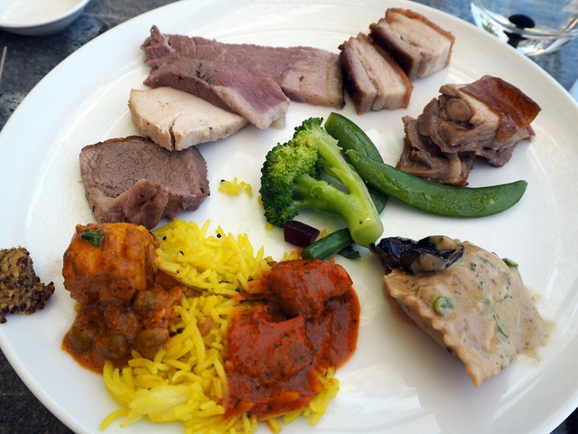 旦那はロースト料理を中心にカレーも。妻は、食べてみたいと思った肉、魚料理と野菜を中心にいただいてきました。いただいた中で夫婦ともに美味しいと思ったのは、ローストコーナーとインド料理。充実しているだけあって、力を入れているのが分かりました。