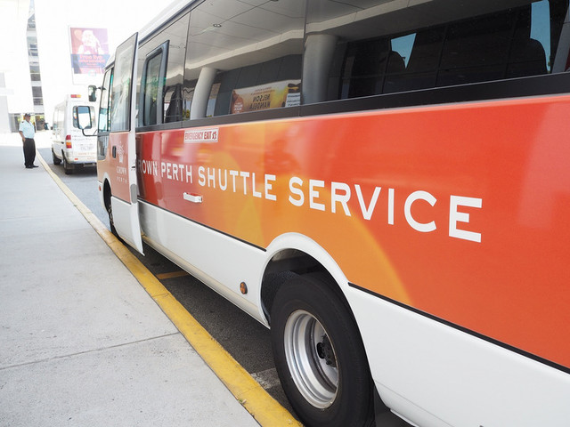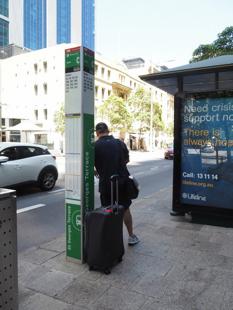 諦めようかと思ったのですが、6つ星のクラウンホテルってどんなところか興味津々。「観光気分でホテルを見に行ってみよう」と、午前中から出かけました。ホテル近くのバス停から、空港方面のバスに乗車、クラウンホテルへ。空港方面に向かうバスに乗って10分。スワン川を越えてすぐのところにあります。