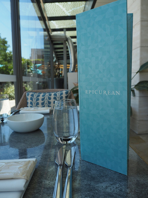 広いホテル敷地内を散策していると、すぐに予約の時間になり、レストランへ。「エピキュリアン」の前は、予約のお客さんでいっぱい。順番にスタッフに予約の名前を告げて席に案内してもらいました。