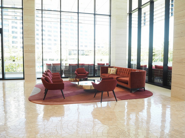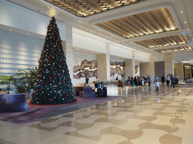 ホテルの広い敷地の中を抜け、「エピキュリアン」のあるクランタワーズへ。ホテル内には広いアトリウムがあったり、いたるところにソファが置かれていたりと非常に贅沢な造りです。タワーズのレセプションは天井が高く広々。人の大きさと比べるとロビースペースの大きさに気が付くと思います。レセプションの脇には、巨大なクリスマスツリーが飾られていました。