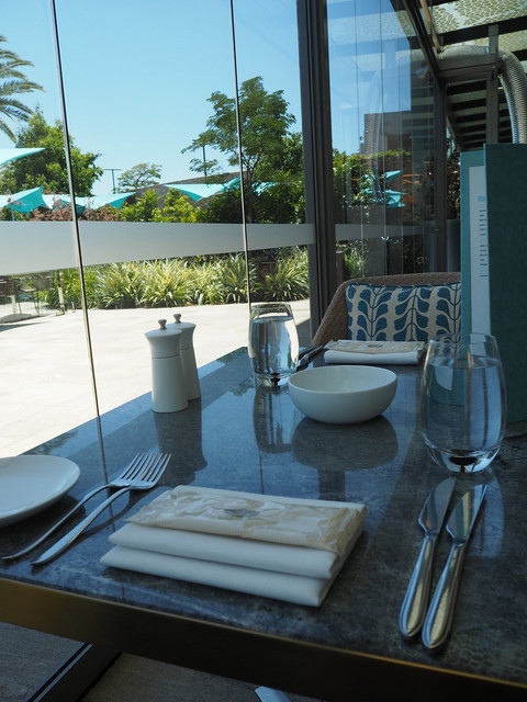 団体席の他、4人掛け、2人掛けのテーブルもあります。天井の一部がすりガラスになっているため、太陽の光が適度に差し込みます。一番外側の2人席に案内されました。ガラスの向こう側は、プールサイド。青いパラソルが見えます。プールサイドに隣接していますが、植栽で目隠しされていますので、気になることはありません。室内の席の方がお料理には近いのですが、テラス席の方が明るく清々しくて気持ち良さそう、テラス席になってかえってよかったかなと思いました。